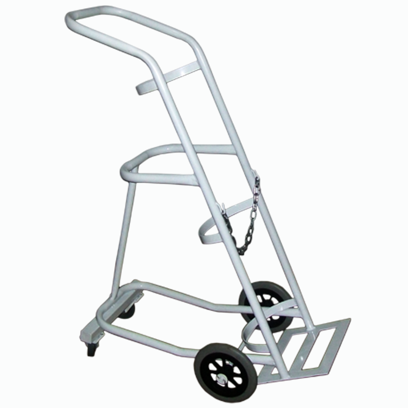 Esta carretilla es ideal para transportar balas grandes de oxígeno con máxima seguridad, estabilidad y facilidad de movimiento, diseñada para uso profesional en ambientes donde la seguridad y robustez son prioritarios.