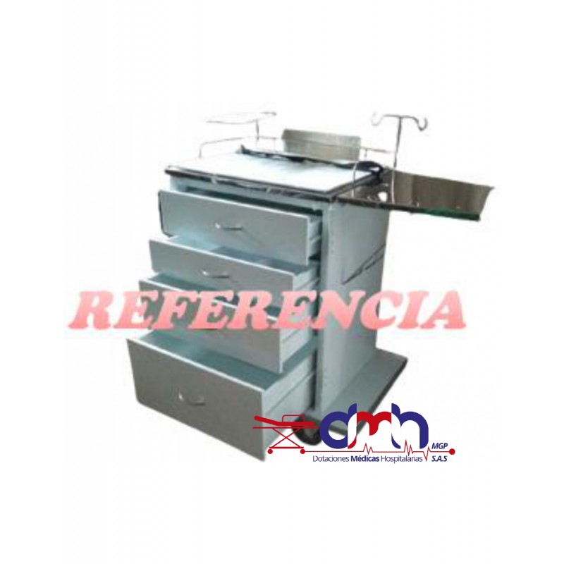 Un carro de paro cardiaco de 4 gavetas es un mueble hospitalario diseñado para emergencias médicas, construido en lámina de acero cold rolled con pintura electrostática para resistencia y fácil limpieza. Cuenta con cuatro gavetas con rieles telescópicos, la superior con divisiones internas para mejor organización. Incluye bandeja superior y auxiliar abatible en acero inoxidable para equipos como desfibriladores, porta tanque de oxígeno con correas, gancho porta suero ajustable y tabla para masaje cardíaco en Acrilico. Tiene cuatro ruedas. Está diseñado para facilitar el almacenamiento, transporte rápido y acceso seguro a medicamentos y equipos en situaciones críticas de paro cardiorrespiratorio, siendo ideal para unidades de cuidados intensivos, urgencias y quirófanos.