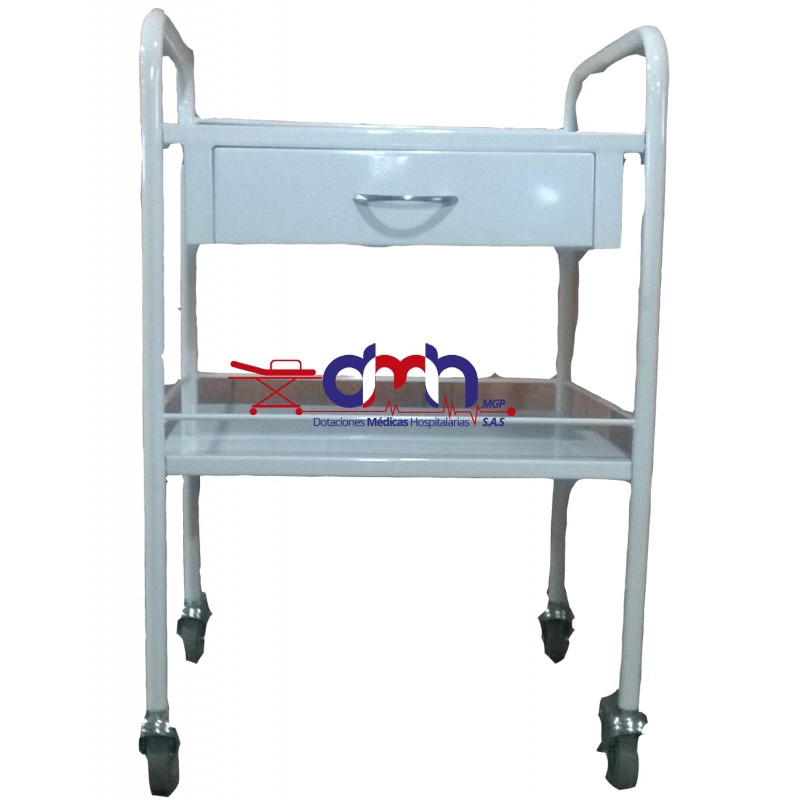 Esta mesa auxiliar pintada combina funcionalidad, durabilidad y facilidad de movilidad, siendo una herramienta indispensable en entornos sanitarios para apoyar diversas tareas médicas.