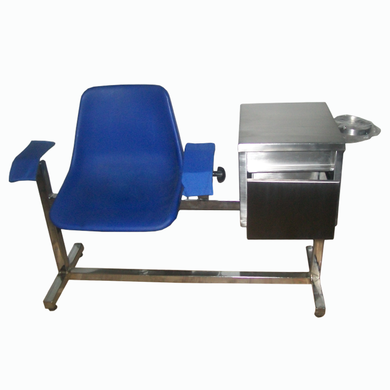 Es una silla diseñada para laboratorios y entornos médicos, con estructura robusta de acero, resistente y fácil de limpiar. Cuenta con asiento y respaldo acolchonados para comodidad, con tapicería antimicrobiana y de fácil desinfección. Los brazos de apoyo son ajustables y acolchonados para brindar comodidad al paciente y facilitar el procedimiento de toma de muestras. Sus dimensiones se ajustan para una postura ergonómica y segura.